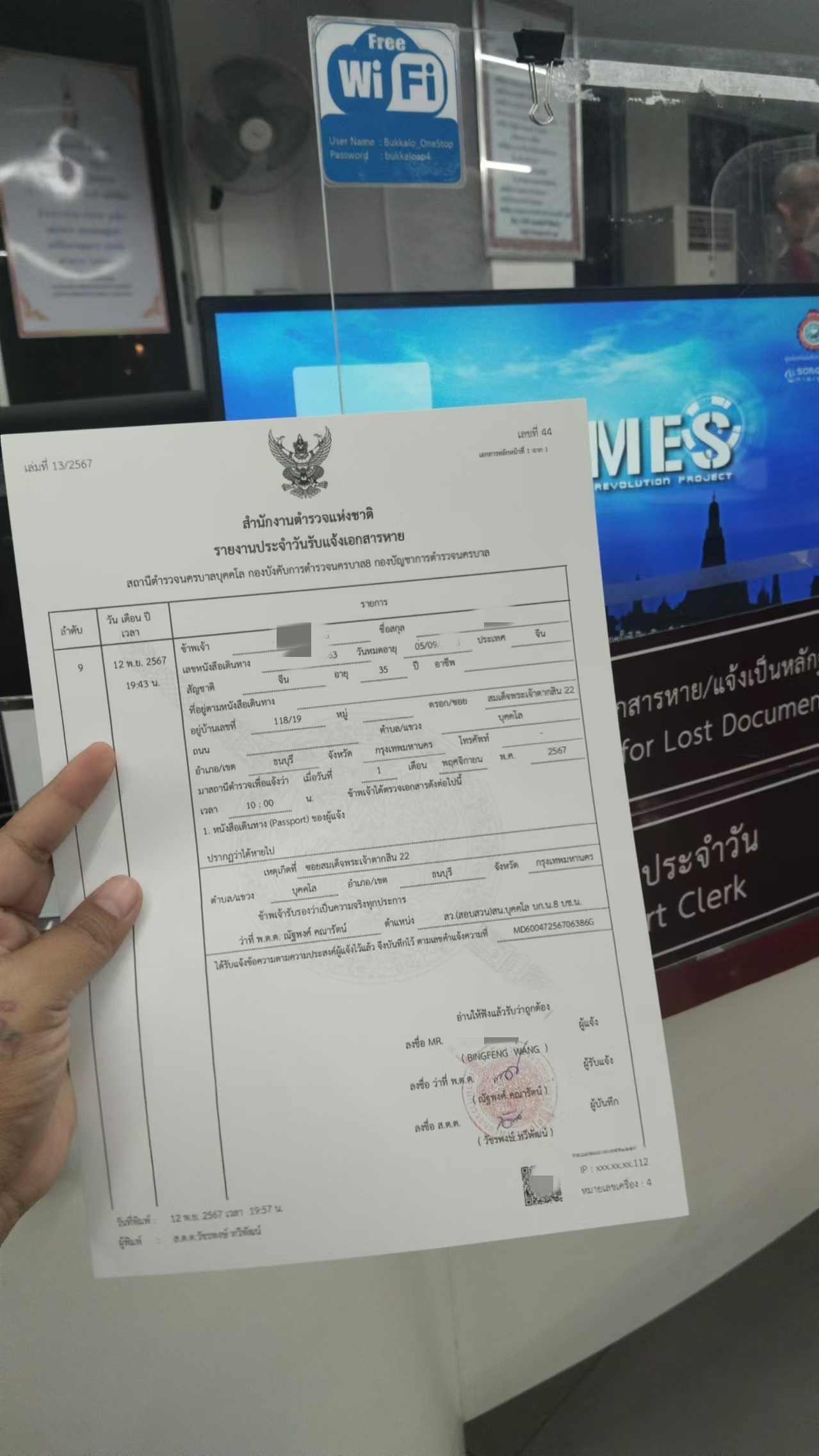 今天早上去驻泰国使馆补护照了,在泰国护照丢了,找华商办理前几天帮我填资料约时间,好快前一天刚找他们做第二天就跟我说约好时间,需要提前去警局办个证明,我都没想到能这么快我人还在清迈呢,后面他们说可以重新约时间,就改到今天了,昨晚她们泰国员工带我去办警局遗失证明,今早又带我来使馆,有人带很是很方便的,你打印照片打印文件她都能帮你,后面需要付钱给使馆娥没有泰国的那个账号,他们泰国员工帮我付了然后我给她现金跟她换,不然我都付不了钱