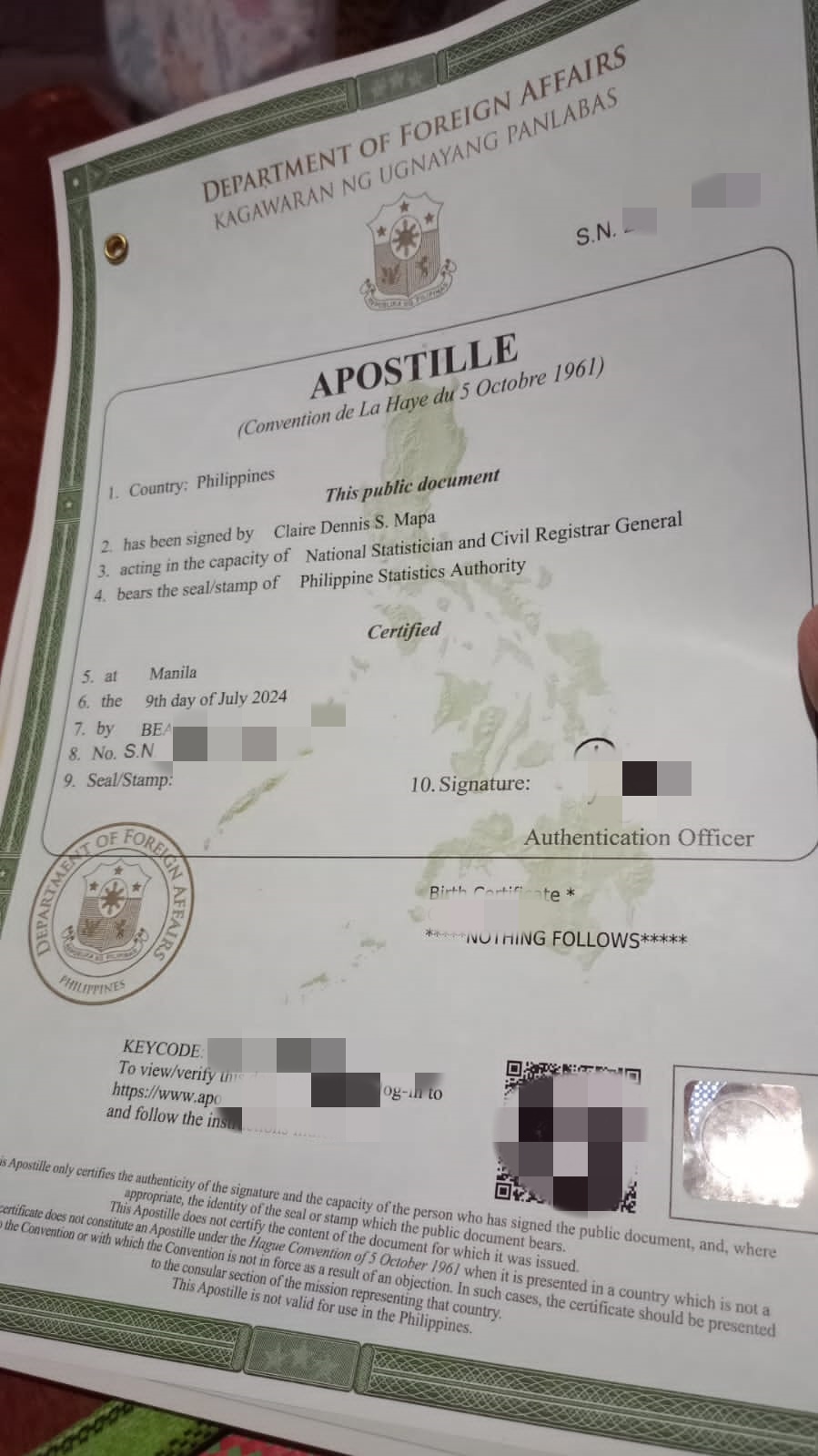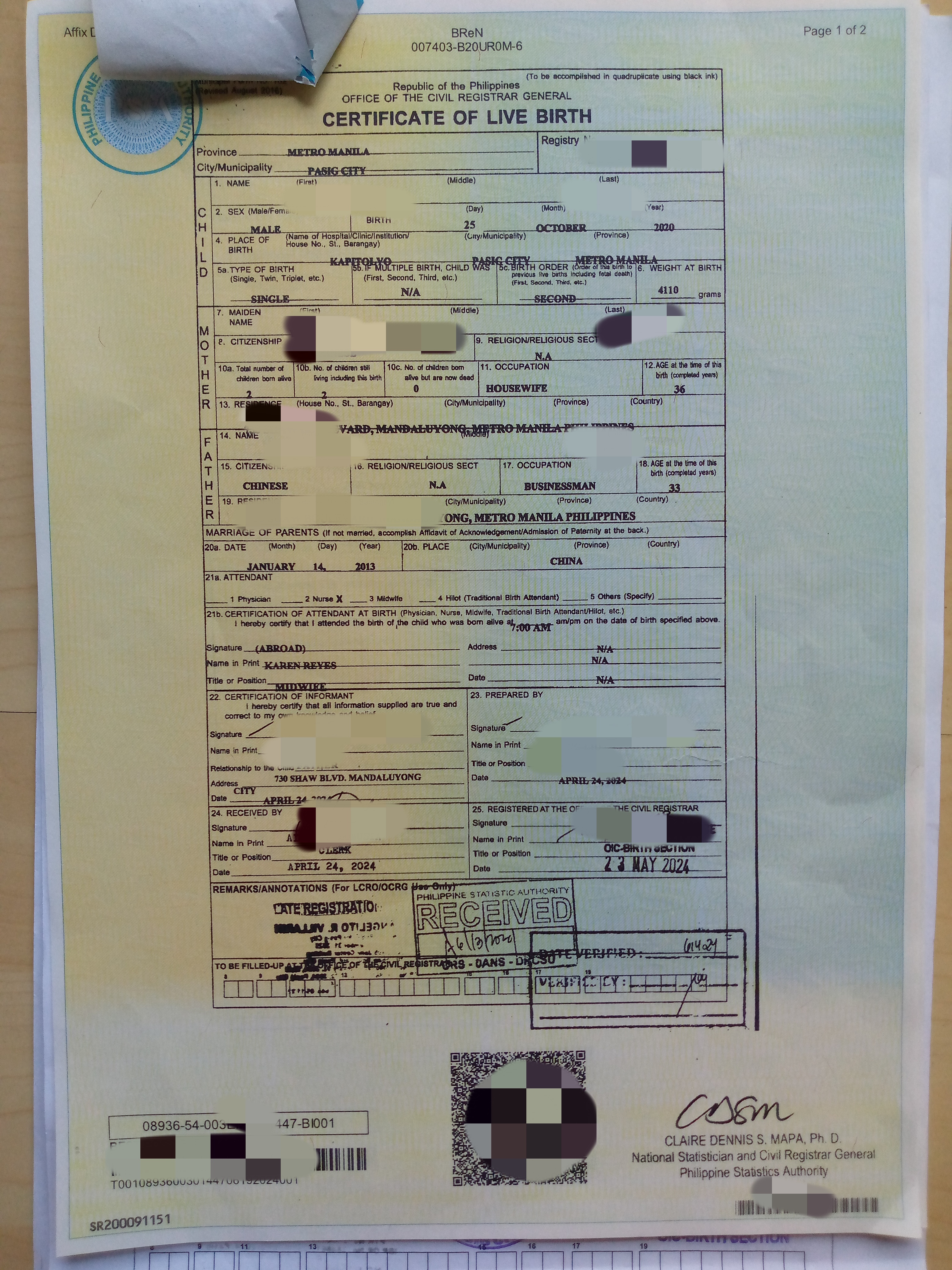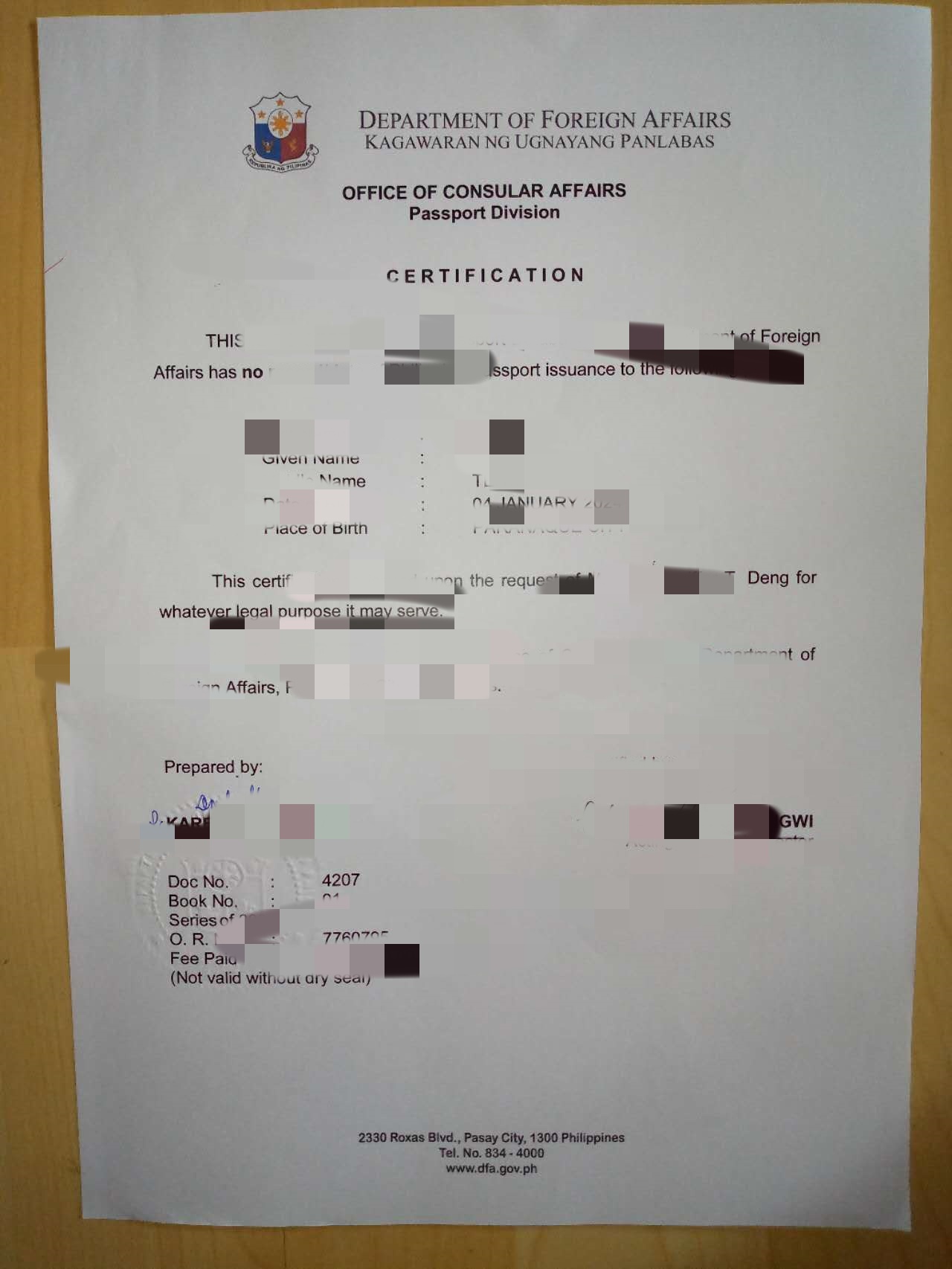 结婚证psa和孩子的无菲籍证明还有孩子的护照还有我老婆的探亲签都在这边做的,现在探亲签就等取证了,孩子护照中途使馆要求补资料补结婚证PSA和无菲籍证明,这些我们原本没有就找华商办的,等这些证件耽误了几天,现在也快办好了。上门取件办好有叫骑手送过来,珍挺方便的