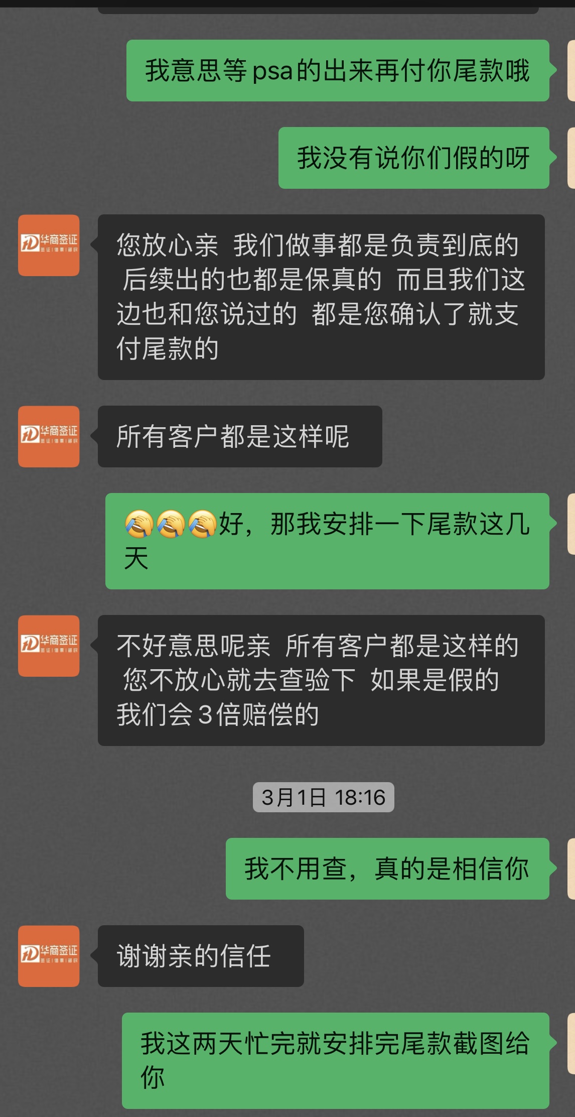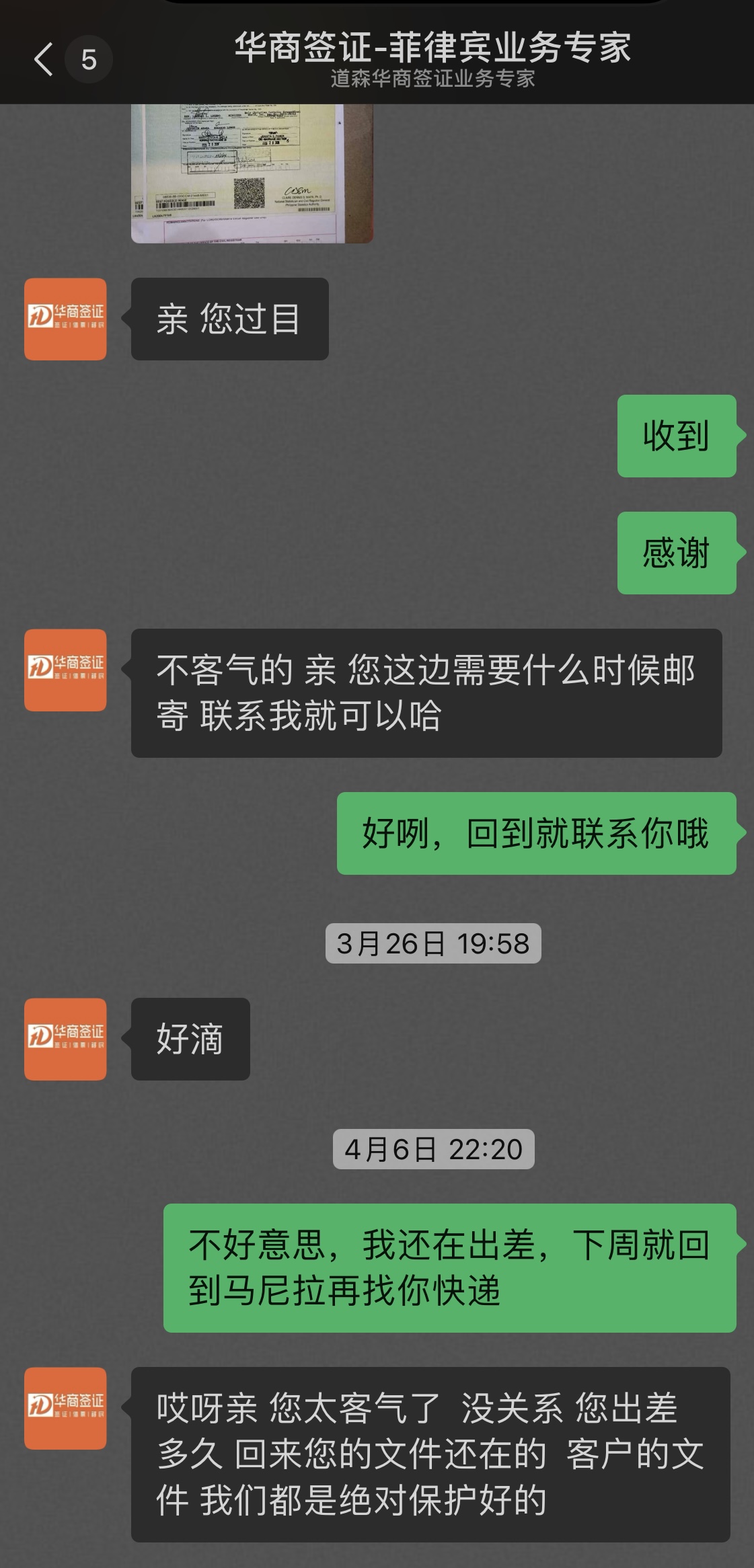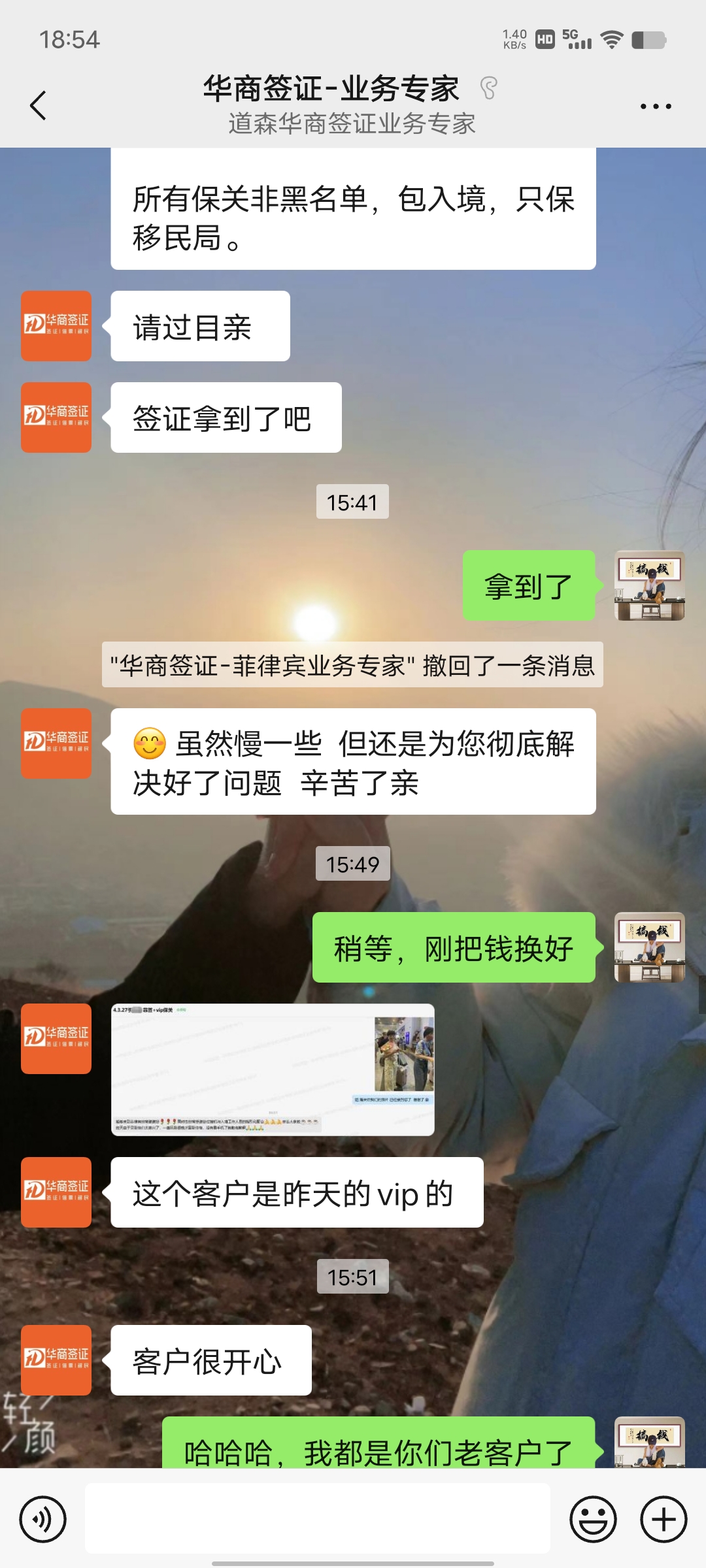 接触很久了,我之前就找华商办理过签证,觉得他们的服务意识、水平、态度真的完全OK,而且我当初入境的时候只有早晨的航班是直达,我买的航班时间他们还没上班,为了给我对接半管的事情顺利入境,还加了个班而且还是能感受到他们还是挺专业;所以现在我朋友也要过来找我,我也让华商帮忙办理,今天也出签了