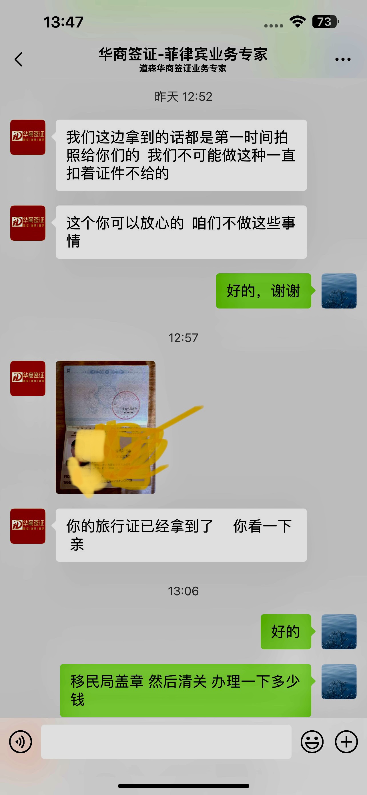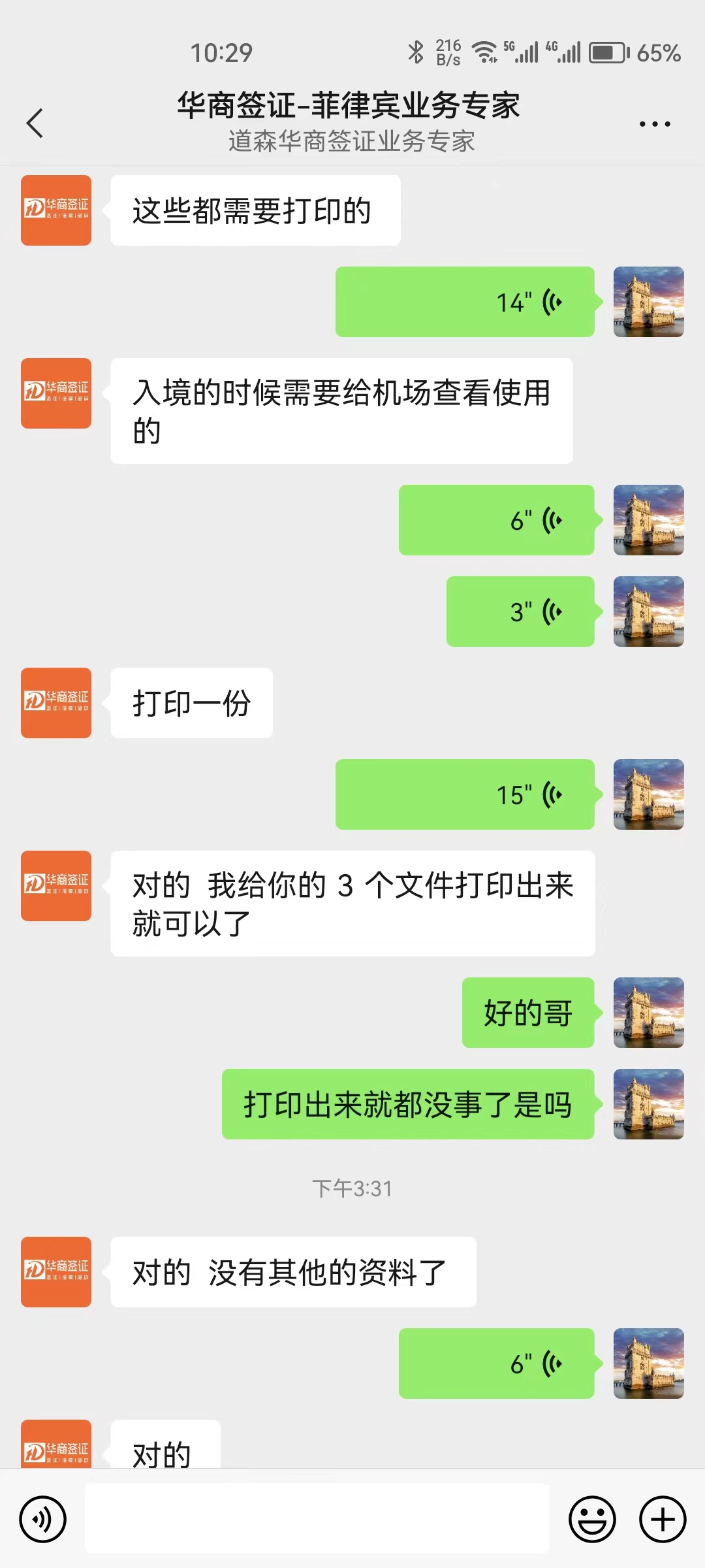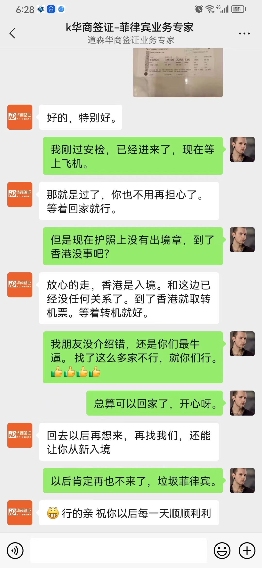 回来几天才来评价。多少有点晚。总的来说华商签证在菲律宾实力真的非常强。我有3个黑名单,在找了无数机构都无法保证我的出境。只有华商签证找马尼拉海关内部的人给我保出境了。 价格也算合理。 过程中非常负责,我有过不信任,也有过情绪波动,都是华商在一直安慰我。 本来出门打工就不容易,想想在菲律宾4年,钱没赚多少,结果黑名单不少,真的非常沮丧。 以后我也不会再去菲律宾了,唯一要感谢的就是华商签证,没有你们我怕这一次是回不来了。感谢你们的专业让我顺利回国。真心的希望你们以后还能帮到更多的人。