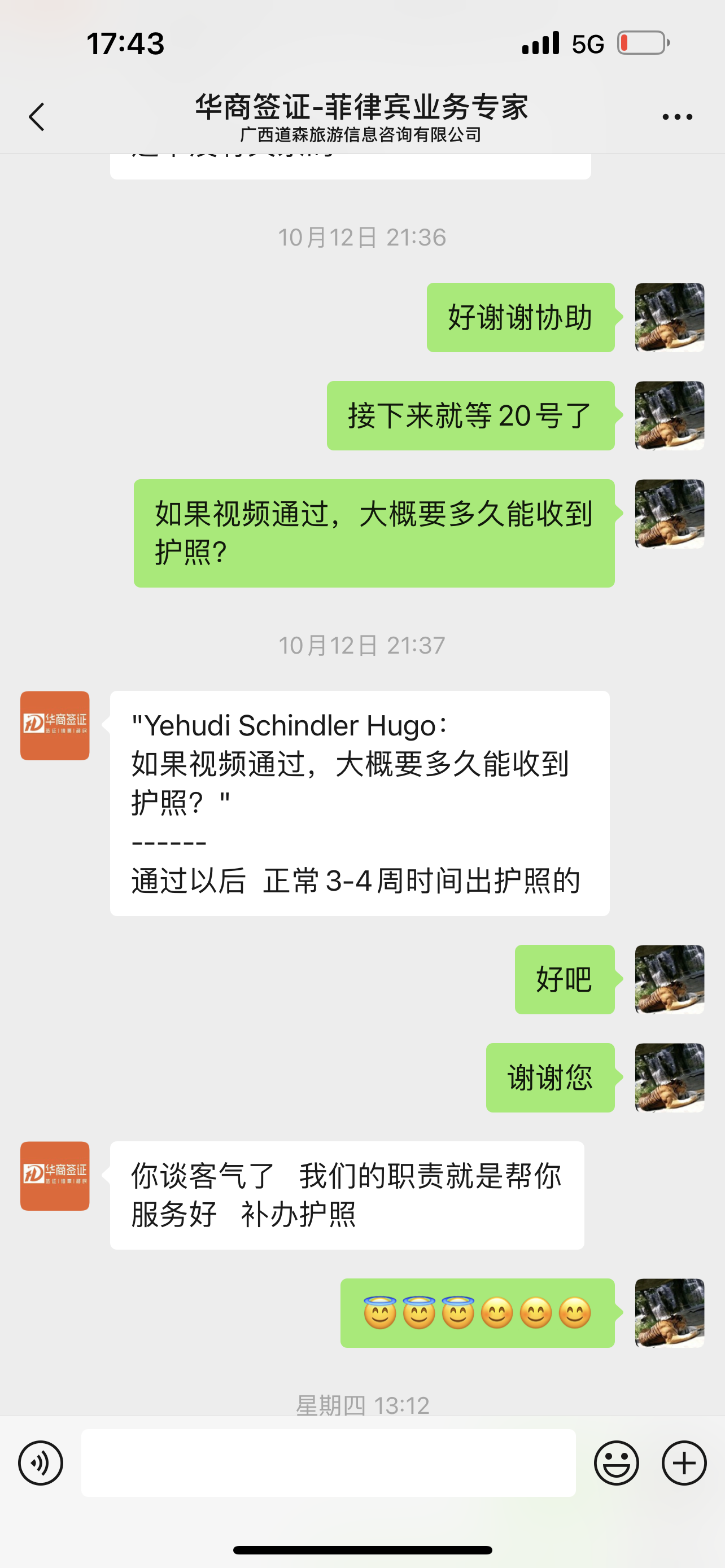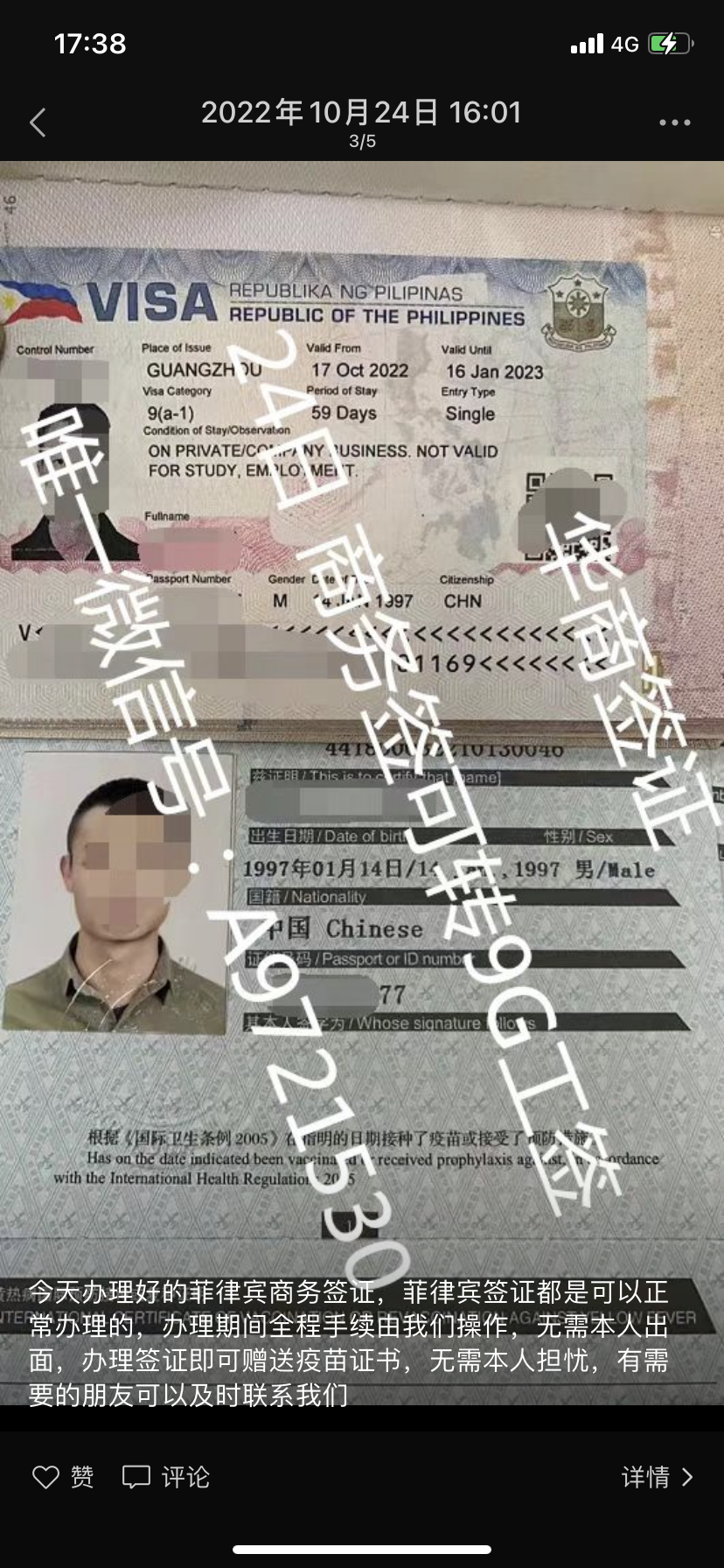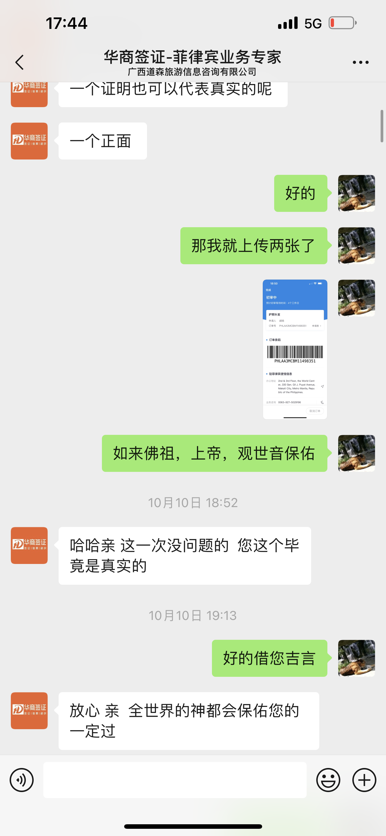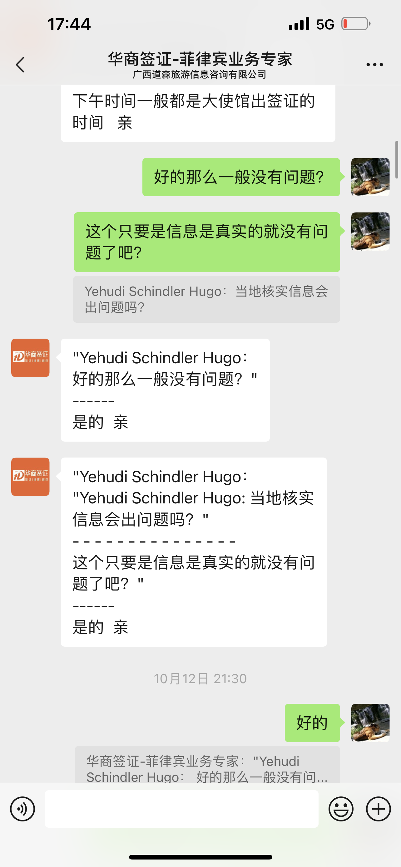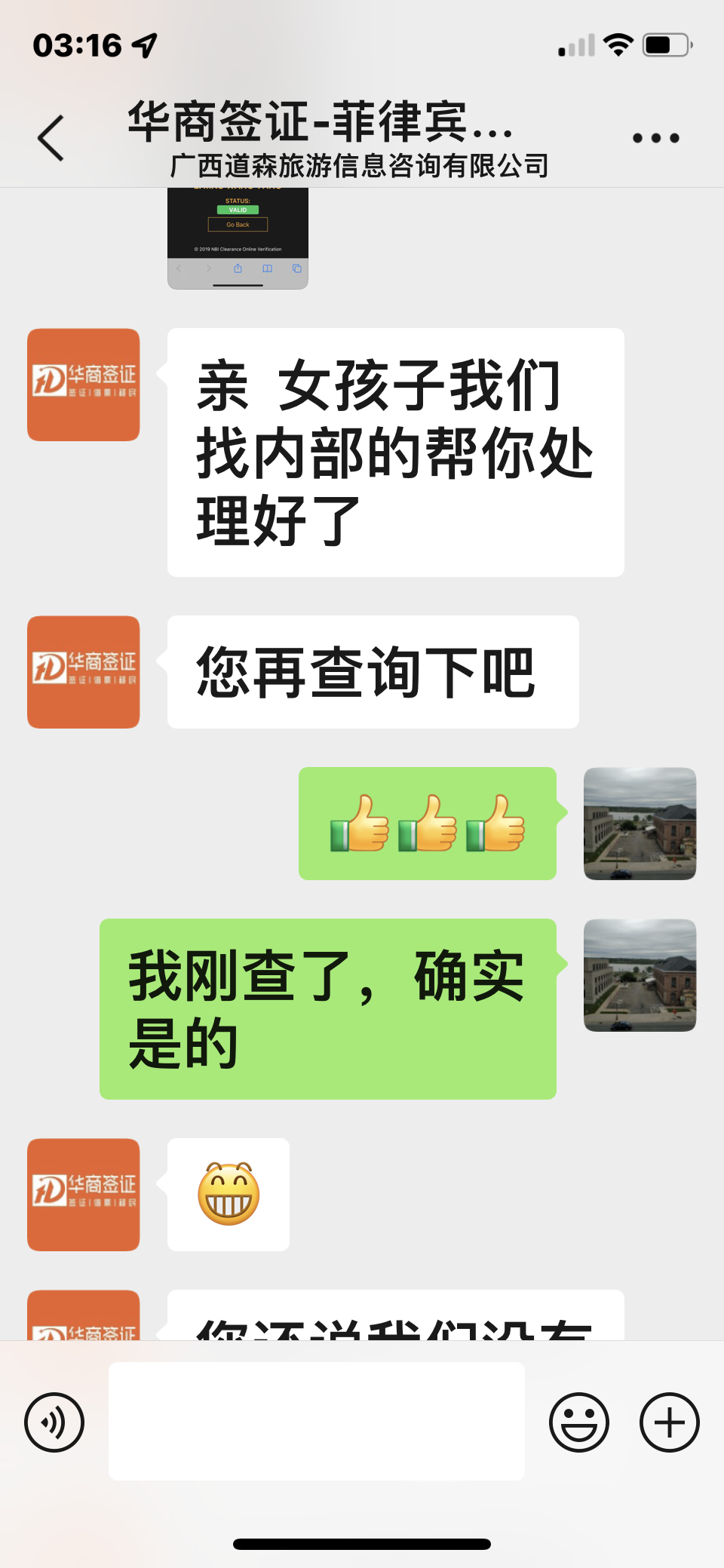 刚才客服告诉我来给他们做个评价,进来了以后先看了一次别人的评价,基本和我想说的是一样的。 总得来说我要谢谢华商。我在国内,我老婆在菲律宾,先从菲律宾结婚证办理,一直到10月25号回国,现在我太太已经到了中国。所有的一切证件,机票全部是华商签证帮我们做的。过程中做的结婚证真的很快,我朋友自己办的菲律宾结婚证办了快6个月还没好,中途被菲律宾人气的半死,一直说菲律宾人死脑筋,我找华商给我办的,我本人还不在菲律宾,结果2周就出来了,他比我提前6个月还没办好,他都觉得不可思议。后面又做了探亲签,华商的小菲也很专业,给了我们很多指导,在探亲签上填的东西很多,都是一步一步的讲解的。 去大使馆面签的时候也是从外省去的马尼拉,机票也是华商给我们原价买的。总之,这一次我的感受是华商实力很强,而且过程中并不是像其他公司只想着赚钱,华商是真的为客户着想,为了这个业务在做事。 所以我本人非常推荐大家选择华商。 相当靠谱。 我本人是不想把做业务的图片发出来的,考虑到个人隐私问题,但是这件事可以帮助华商签证,所以我会加入图片。让更多的人看到,总之我希望华商签证生意兴隆,以后可以帮助更多的人。