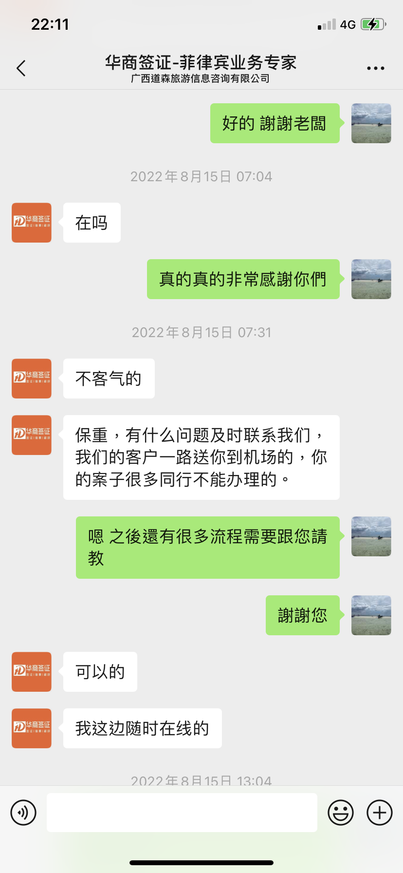 华商签证,服务态度满分,和华商沟通,满满地都是爱意,有不懂地都会及时沟通解决,服务到位,事无巨细安排得明明白白,作为在菲一家签证机构,基本上做到了满足客户所有的需求,消息基本上都是秒回,而且很耐心,我申请护照一年多了,华商不到一个月就能帮我搞定,对比价格,实在是太实惠了!整个菲律宾找不到如此高的性价比?。。∪绻慊乖谟淘ヒ灰宜欠竦幕?,看到我的评论就不要再犹豫了,直接下单吧,保证解决你的任何疑难杂症!