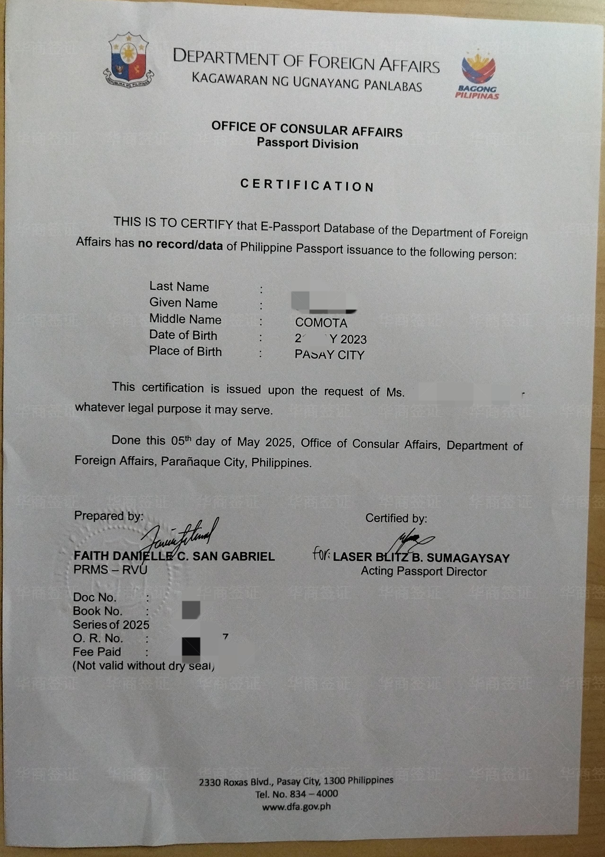 给孩子办的无菲籍证明,用来补护照的,我们以前都不知道这个东西,补护照过程中使馆要,我们又不懂就找华商办了,一个星期就办好了,现在孩子补护照也交给华商去办了,后面就带孩子再去一次大使馆就行,省很多麻烦
