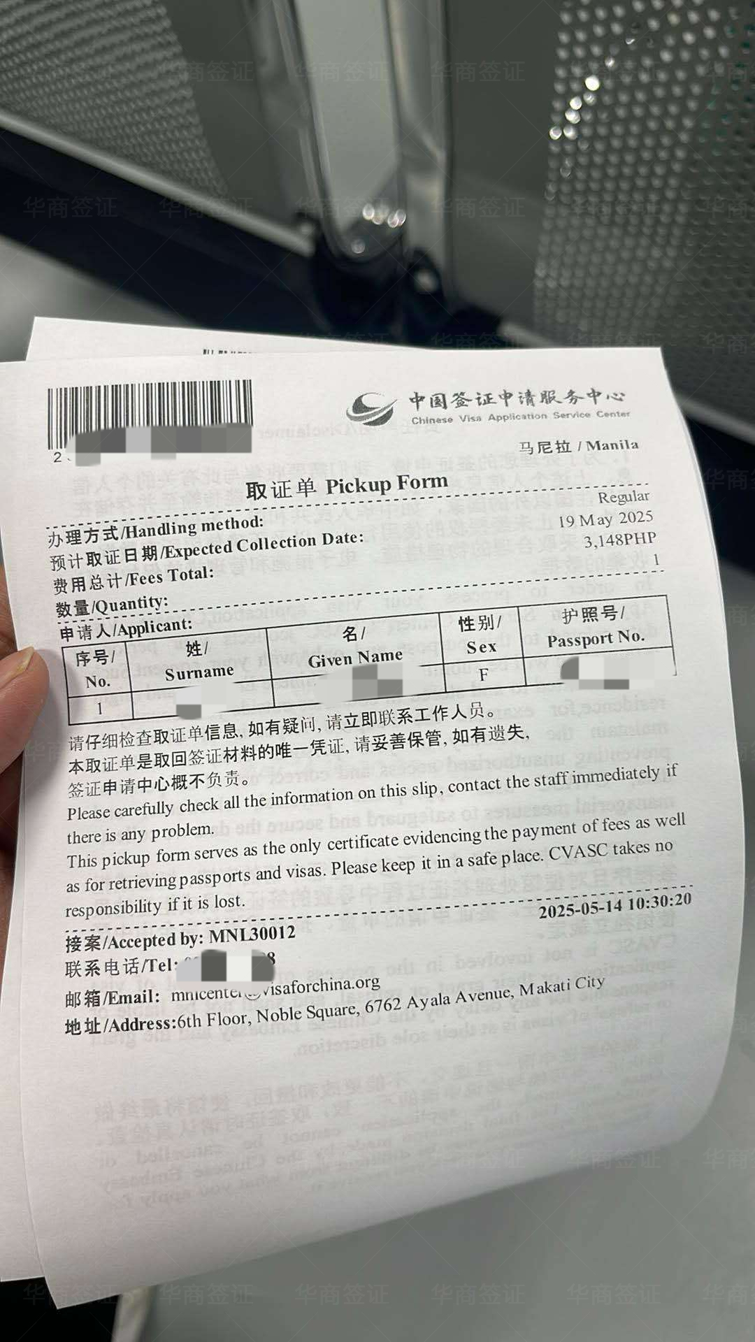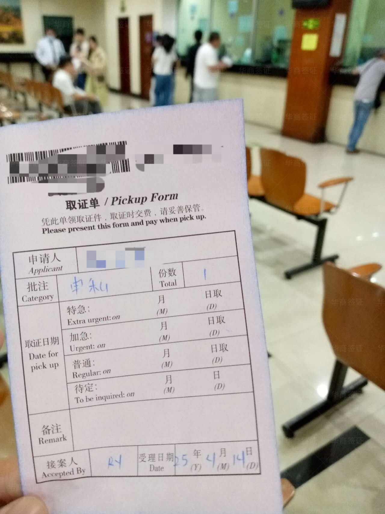 给我老婆办的中国签证,前两天华商在给我们准备资料,很细心很全面,都不需要我们做什么了,华商全给我们弄好了,今天已经拿到取证单了,在等过几天就能取证了